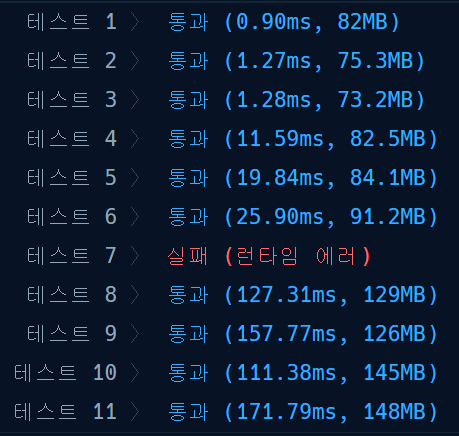 결과를 보니 테스트 7번만 런타임 에러가 떴다.