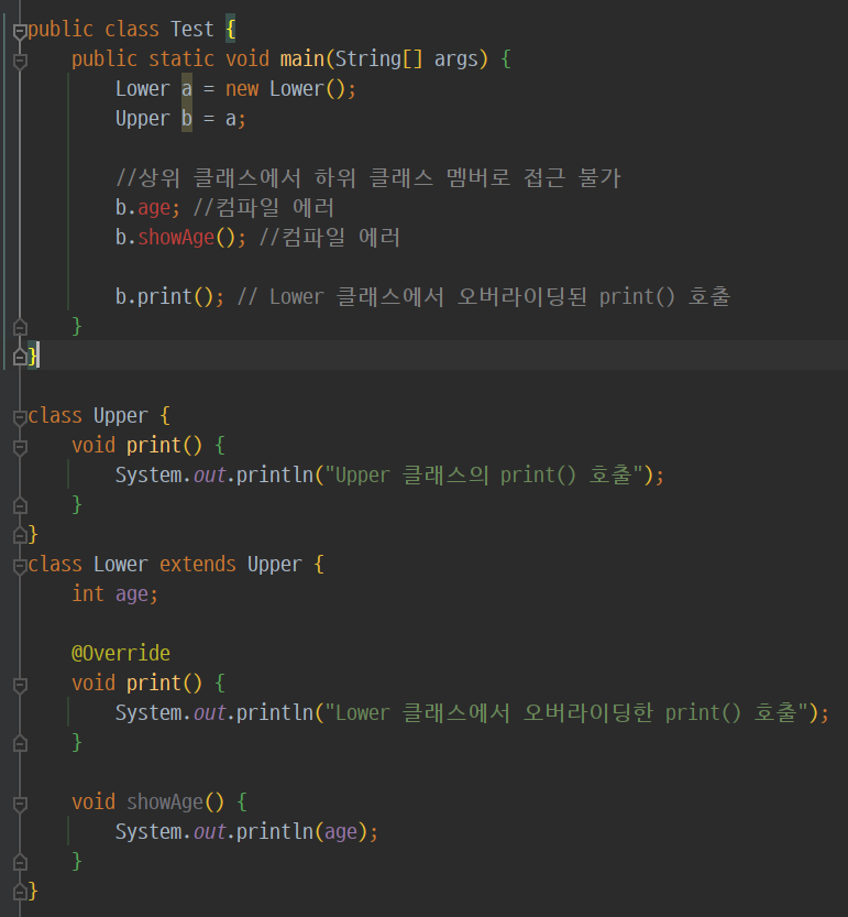 하지만 두 번째 줄을 보면 변수 b에 Lower 클래스 참조자료형 변수 a가 대입된 것을 볼 수 있다.
