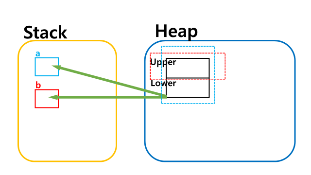 위에서 봤듯이, 두 변수는 같은 참조값, 즉, 메모리에서 같은 주소값을 가리키고 있지만 접근 가능 범위가 다르다.