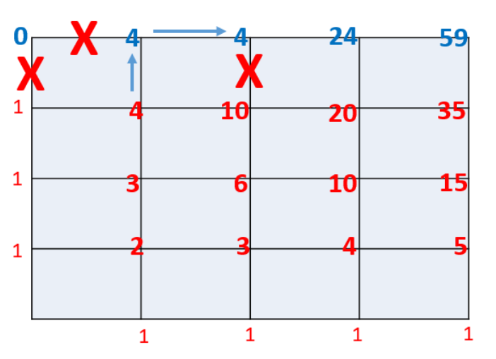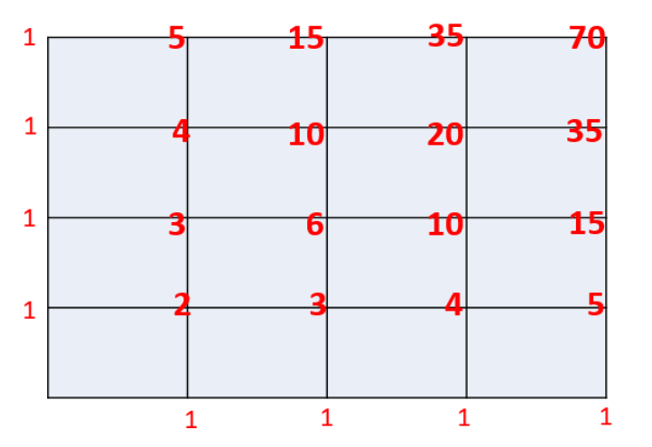 먼저 아무 조건없이 격자 맵을 이동할 때 각 꼭지점마다 도달할 수 있는 경우의 수를 적어서 최종 목적지까지 도달하는 경우의 수를 구하는 방법을 생각했다. 이동 방향이 왼쪽 아래에서 오른쪽 위로 이동하기 때문에 현재 자신의 왼쪽 지점과 아래 지점까지 도달한 경우의 수의 합을 적어주면 된다.