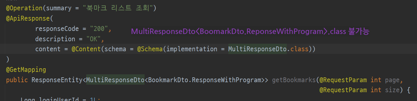 @ApiResponse의 "content" property에서 implementation class에 class literal을 적어야 하기 때문에 generic을 가지고 있다면 Swagger에서 자료형을 특정할 수 없기 때문에 값을 덜 채워준다.