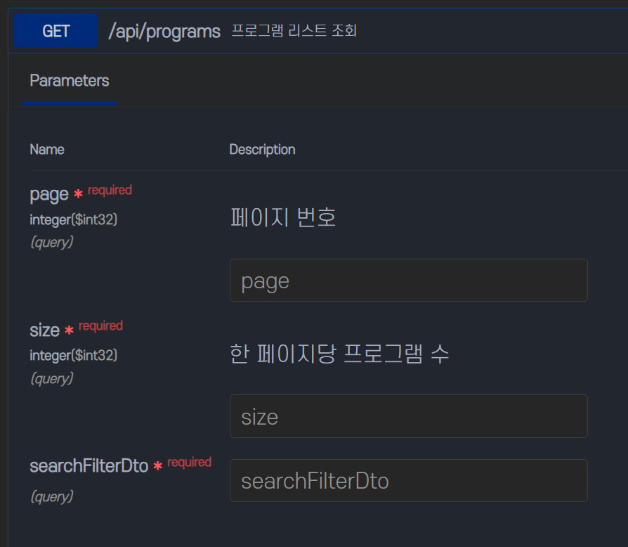 하지만 Swagger에서는 SearchFilterDto 클래스의 각 파라미터(필드)를 보여주지 않고 searchFilterDto로 묶어서 보여줬다.