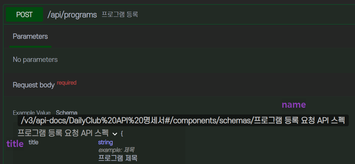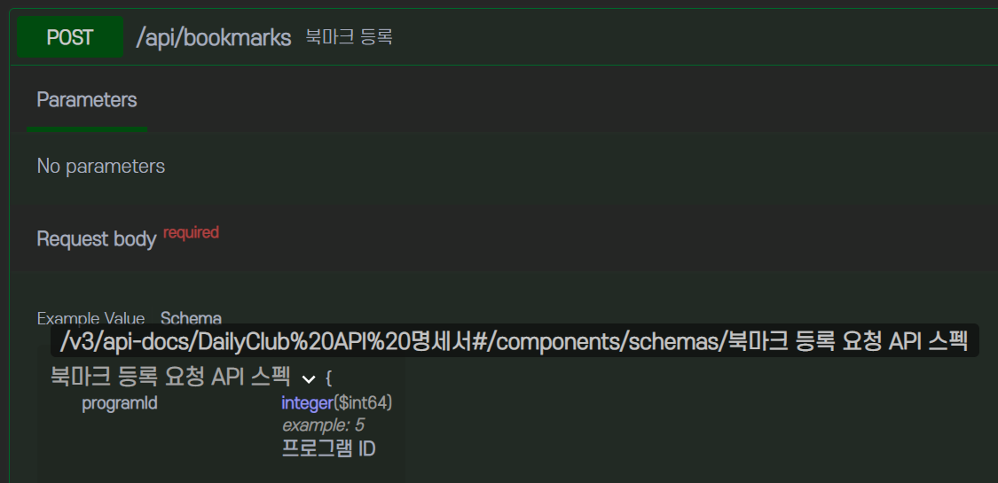 서로 다른 엔티티의 API에서 각자의 스펙이 적용되지 않고 하나로 중복되어 나오는 이슈가 있었다. 위에서는 프로그램 등록 요청 API 스펙과 북마크 등록 요청 API 스펙이 서로 같게 나오는 상황이다.