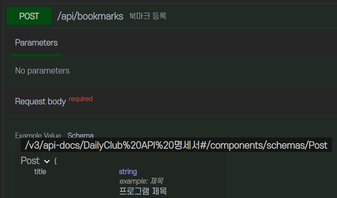 서로 다른 엔티티의 API에서 각자의 스펙이 적용되지 않고 하나로 중복되어 나오는 이슈가 있었다. 위에서는 프로그램 등록 요청 API 스펙과 북마크 등록 요청 API 스펙이 서로 같게 나오는 상황이다.
