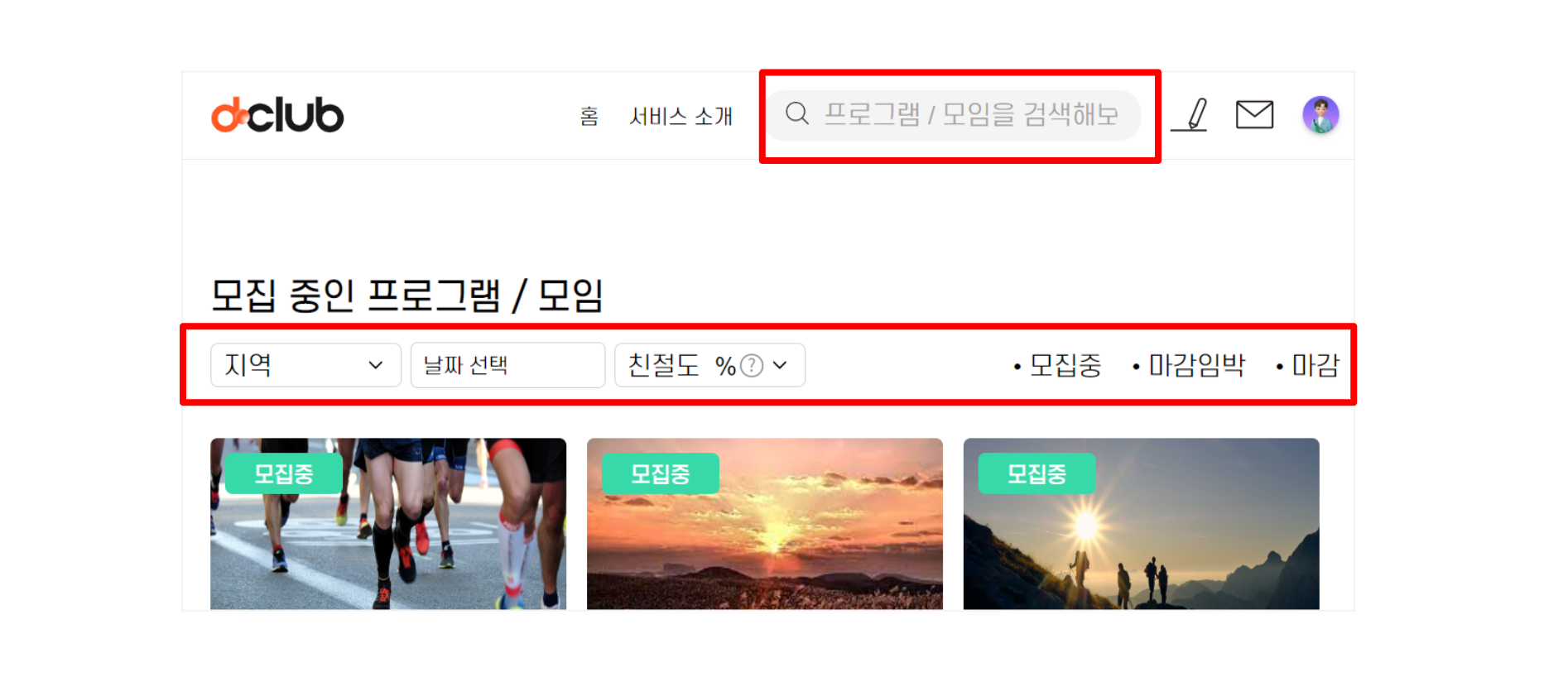메인 페이지를 보면 헤더에 검색어를 입력할 수 있고, 지역, 날짜, 친절도 등 다양한 조건을 입력해 모임을 필터링할 수 있는 기능이 있다.