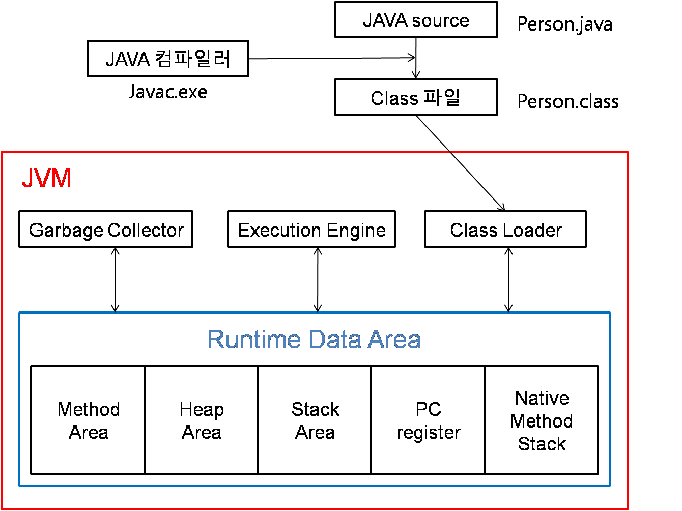 JVM은 운영체제로부터 할당받은 메모리 영역(Runtime Data Area)을 Method area, Stack area, Heap area로 나눠서 사용한다.